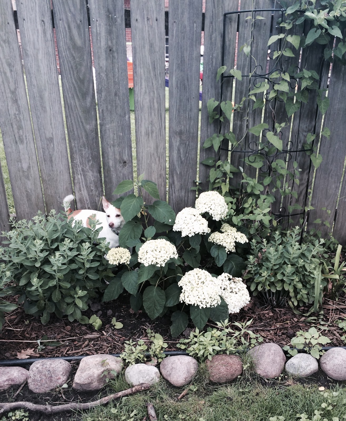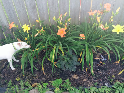 Here's my pretty picture blog post starter and as per usual, if it's outdoors, Milo is photo bombing. These are not day lily's, they're some sort of perennial type (Help, Beth!) that bloom for weeks. I'm looking at bulb catalogs---already, and I'm going to add in some additional colors. I love that these come up where my tulips have died off. It's hard to see but I have my wee little lilac right in the center. As it grows it will bloom right after the tulips and daffodils. Excuse the weeds in the forefront...may do a bit of ground cover or low growing flowers here. Any other suggestions?
