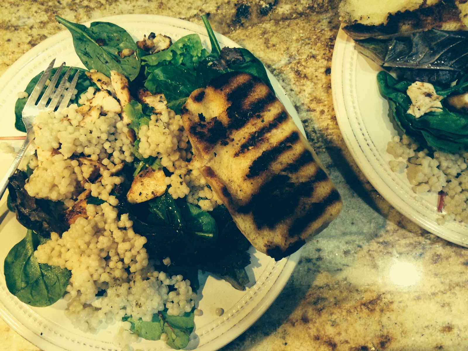 In a last ditch effort to trim down---at least lose some water and puffiness, we are eating salads as much as possible. No true recipe here. Just a mix of baby lettuces, some cous cous, shredded seasoned chicken that I did on the stove in a cast iron grill pan and then tossed with a lemon/herb vinaigrette. I had some rolls leftover from some sandwiches we had for lunch Sunday and I wanted to use them up so I drizzled olive oil on them and grilled them right in the same pan where they picked up the herbs. I know the bread was a bit overdone but it was good. I think I've dashed my hopes of being a future Foodie Blogger/Photographer. ;-) I could rave about this forever. I meant to add some black beans for more protein but forgot. Play with this. Omit the chicken if you'd like.