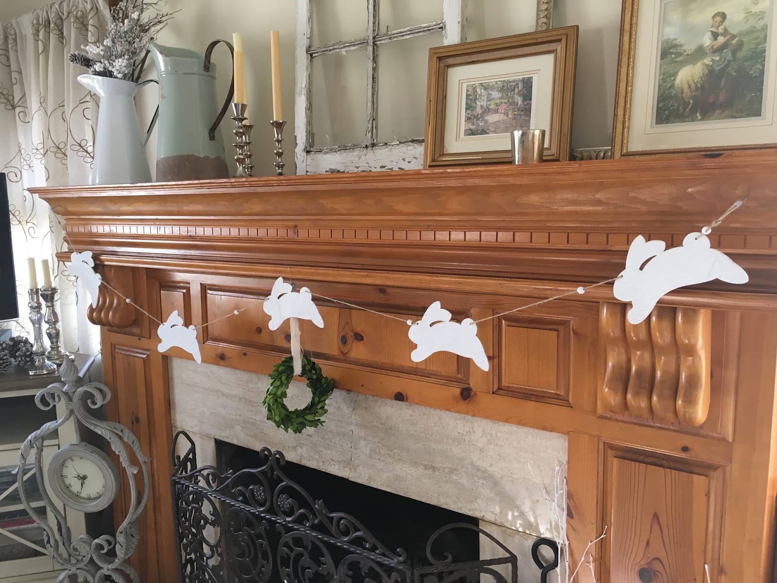 The Bunny above sits on my mantel. Its made out of a soft linen and is very huggable.