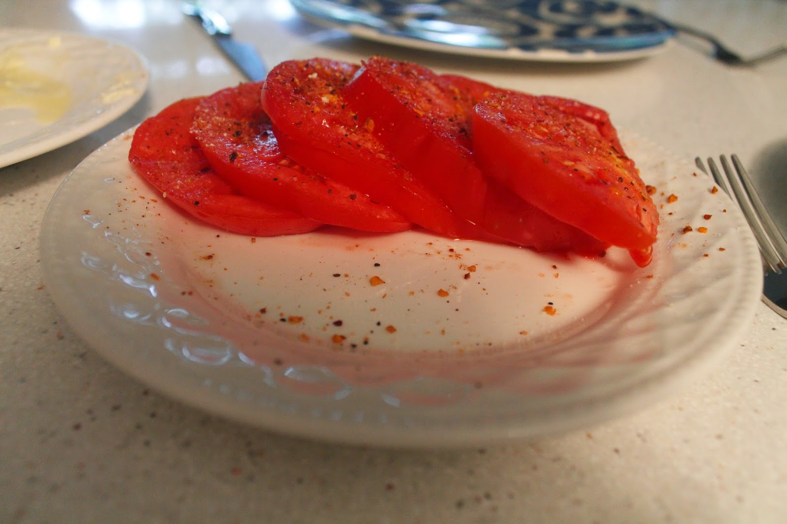 Dress your plate as in the recipe above. Arrange raw zucchini slices and roughly chopped red pepper all around. Sprinkle S & P over to taste.