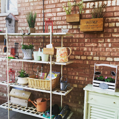 I did my 'not so fun' work first; Pulling weeds, reseeding, mulching and general clean up. I really wanted to put some of my fun decorative pieces out on the patio but I was potting there and it was a mess. Finally I moved everything out to the picnic table and spiffed up the deck and my baker's rack. The Husband and I bought this monster at Nordstrom's Rack about 15 years ago when we both worked in downtown Chicago. We threw caution to the wind and parked in the alley where we pushed and shoved and maneuvered it into the back of his Aviator. I never thought it would fit but he's an optimist. It used to be pale green but its seen better days. Someday I may paint it. Or not. I found the little cabinet next to it at a second hand shop years ago. My late sister, Leslie, helped me paint it. My first project like that. Anyway, I had fun playing. The only new thing I have on here is the little plant on the top shelf and the green pails on the second. I don't know what on earth I can do with those...any ideas? Or just leave things alone? ;-D