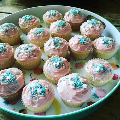 2 days ago Emily had another ultrasound and at sixteen weeks the doctor was pretty sure he could tell the sex of the baby. Emily and Mike wanted to have a gender reveal party but unlike Kevin and MC, where the results were called in to a bakery and the cake had a tinted filling (pink or blue), they opted instead for finding out the gender right then and there, having the party and surprising all of us, family and friends with a box filled with helium balloons (pink or blue). I believe that was the biggest run~on sentence in the history of run~on sentences. Sorry. I couldn't believe she was going to keep me in the dark as well. My daughter! The one I carried for 9 months, gave birth to without an epidural, who cried herself silly for 8 straight weeks until she figured out what her thumb was for. So I made these cupcakes for dessert. Grrrrr...talk about loyalty.