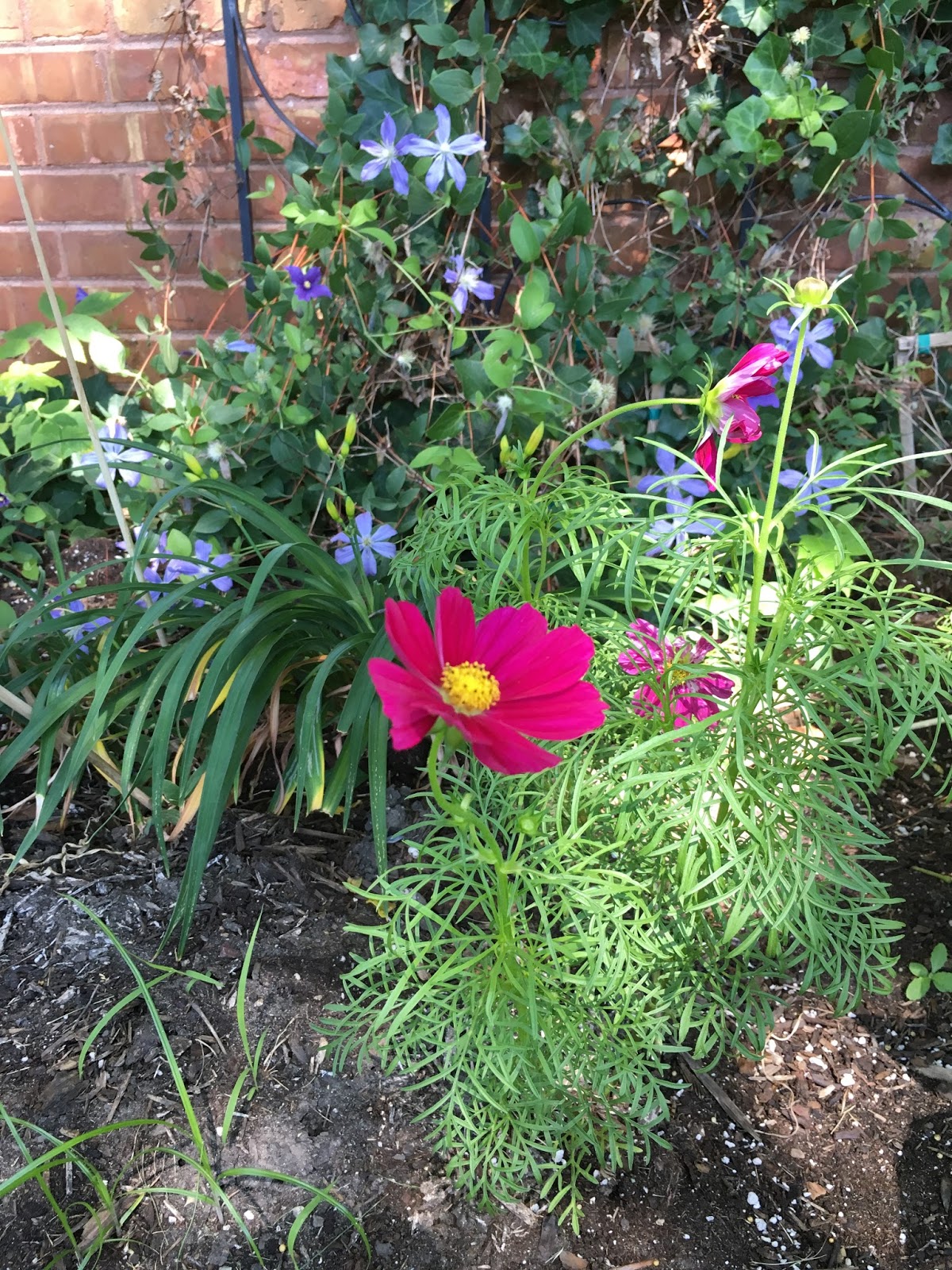 The bed along the house is doing great. The pink clematis have died off for now but will be back. I wish I had the names of the varieties. The purple ones are doing well. I have bunches of cosmos planted here and there to fill up space. In a few weeks I'll hit some garden centers to find perennials on sale to add and fill in spaces. Still, I may continue to add cosmos every year...I simply love them and their fluffy leaves and how they sway in the wind.