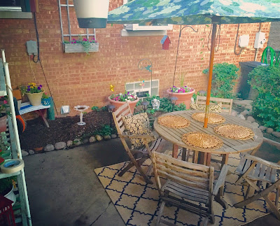 I finally got the patio tidy and clean. I wish I had been patient enough to power wash it but I have to say, its seventy years old and has cracks like an earthquake hit it. I make do with a cute rug and plants to distract. Recently I found an indoor/outdoor rug at Home Depot for a terrific price. I had some mildew or mold on my last rug and I know I might have removed it but I never liked the bright lime green color. I had really toned down some of the bright colors everywhere. I had been one dime short of a few colorful gnomes from Walgreens. Nothing else is very new. I had these place mats which were pretty beat up (and I hope the birds don't find them perfectly satisfactory for nest building after my recent tragedy), and I also found some old pillows I can hide away. I just tuck them in a corner when I know we have rain coming. I'm so loving my retreat. Afternoons puttering and pulling weeds, reading around 4:00 p.m. before the sun moves far enough west to start to blind me and then one last hurrah for the dogs about 8 p.m. Heavenly.