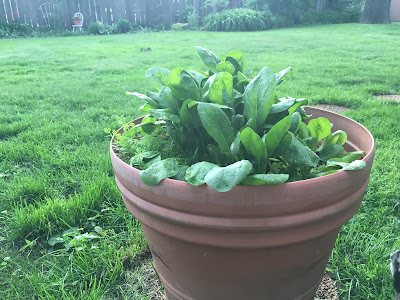 I used to plant tomatoes in this humongous pot but they never made it with the squirrels and their daily volleyball matches with my just ripened babies. Or they'd take one bite and spit it out like a spoiled child. Back in March I planted spinach, butter lettuce and baby carrots. I've already made a few delicious salads. A nice trick I learned from a fellow gardener at the lake, don't pull the whole plant out. Hold a few very gently at the tips and use a serrated knife to do a sort of 'crew cut'. The plants will grow again and you'll get a second harvest. We've had great salads and sandwiches and BLT's. The little carrots are dwarfed by the lettuce. Maybe next year I'll give them their own planter. These may do well when I use up most of the other greens. Am I boring you?