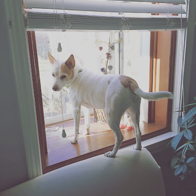 The melted snow is nothing to get excited about, Milo. These have been really lazy days for the dogs. The house at the lake really wears them out. We have floor to ceiling windows in the Great Room so they are always watching, on guard for anything from a chipmunk to Big Foot. They take their jobs seriously. As you can see from this picture, access to windows here in the city aren't as easy to maneuver.