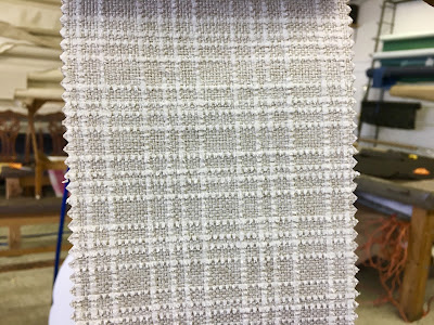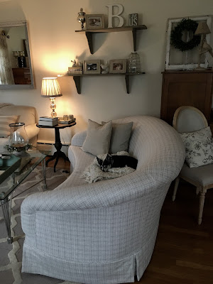 My new and improved reupholstered sofa was delivered back to me on Monday. I'm really happy with it. I shared a picture of the sample fabric in THIS post if you want to see it close up. It's sort of a window pane pattern, cream on taupe. It looks nubby but it's actually soft.