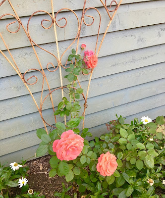 I had thought that I lost my climbing rose over the past two summers of neglect. It had a weedy sort of vine strangling it, so one day The Husband went crazy after the weed and gave it a good snip. Myself, I have an aversion to thorns. Funny, the rose started to shoot up and bloomed. As you can see, some of it is growing outward, so once again I have to start the training and attach it to the trellis. Aren't these the most beautiful blooms? I can't remember the name of the rose, but if I can find all of my gardening journals, we may find out. The surrounding daises are doing well with a little deadheading. Little pleasures.
