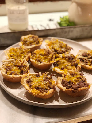 Preheat oven to 350 degrees and spray your muffin tins with cooking spray. Using a rolling pin, roll out the hamburger bun halves until thin and then gently press into each muffin cup.