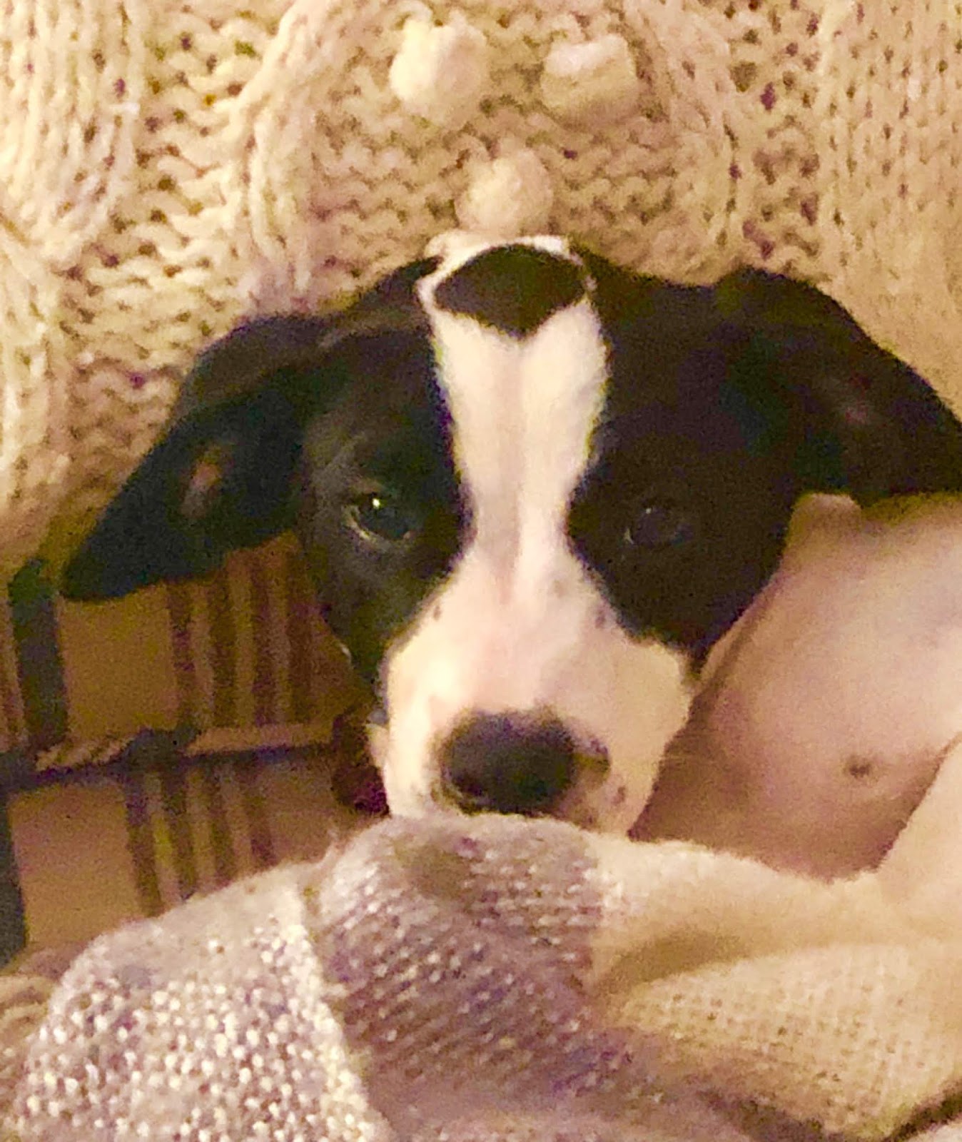 At 13 weeks now, she has a loving and crazy personality of her own. Affectionate, playful, mischievous, and smart, she has stolen all of our hearts. We are not quite sure what sort of breeds she comes from, but most of the people who adopted dogs that came from Kentucky agree they are at tops--hounds of some sort. I think it's a little uncanny that from the neck down she is a black and white version of Milo with the long body and tail, and random spots. Terrier indeed. In the photo above, taken last week, I was bowled over that her ears stood up. Even my vet predicted her floppy ears would never stand! But they do when she hears or sees something that captures her attention.