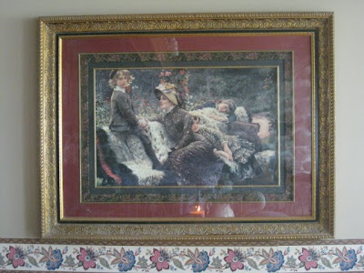Above is a painting we bought years ago. I have no idea who painted it but it looks a little Victorian to me. I by no means, tried to do the Lakehouse in a Victorian decor, I just loved the painting and it went well with the wallpaper, the border of which you can see below the painting. I then started to pick up colors from the painting, but the style of the furniture and room is just ALL OVER the place...