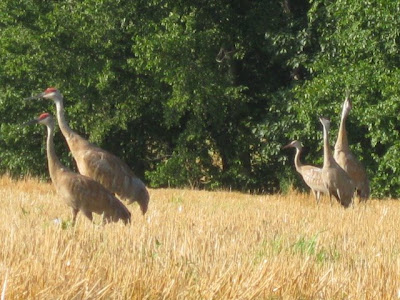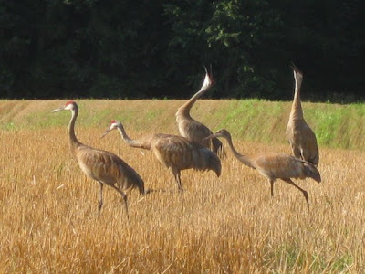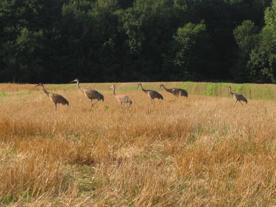 Finally I wanted to show you a really neat sight that we saw coming back from a bike trip. The Husband bought me a new Treck bike. It has 24 gears. I have so much fun riding it. We went to a town about 15 miles away and rode along the banks of the St. Joseph River. I didn't have my camera, so take my word for it, it was a beautiful ride. So coming back, we rounded a curve and saw this group of Sand Hill Cranes (no, I didn't know that is what they were until my neighbor looked at the pictures and identified them. I thought they were herons and The Husband thought they were turkeys!! LOL!)