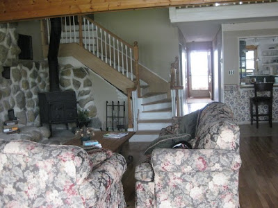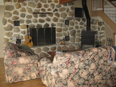 Another view of the Great room where you can see the fireplace and stone wall. The previous owner who built this house, gathered all these stones himself from local farm fields. Ignore the spear gun over the fireplace. The Husband put that up there just to antagonize me. It is coming down. I just don't know what to hang there yet. And the guitar, I don't know whose it is, but it looks good. Ha Ha.