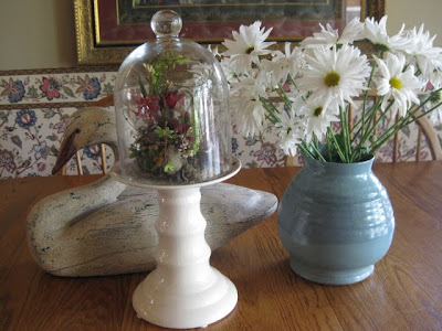 I missed the last Cloche Party as I didn't have a clue what a cloche was. I caught on a bit after visiting some of the party goers. I loved all the pretty arrangements under glass and was determined I would make a darn good one!! On my trips to little resort towns in Michigan, with all sorts of shops and boutiques, I searched and searched for cloches. No one knew what I was talking about and I certainly wasn't articulating it well. Finally, I was in a little shop that sold gourmet food. And there it was. A beautiful white pedestal with a gorgeous dome. Inside was a jar of gourmet peach preserves. I talked the owner into selling me the whole set up. She thought I was nuts. I didn't dare explain the cloches or the party. She seemed glad to get rid of me.