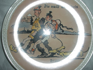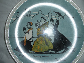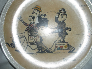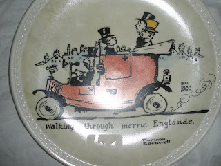 Finally, I saw four little plates hanging on the wall. They are about 5 inches in diameter. The artwork caught my eye. It's sort of whimsical. Quirky, if you will. Like me. Upon scrutiny I discovered the artist is none other than...Norman Rockwell! Who would have thought? The same guy that illustrated the Saturday Evening Post for 500 years. The guy with the museum in Stockbridge, Massachusetts. The guy that did the pictures of the poor, frightened little kids in the doctor and dentist offices that used to hang in every doctor and dentist office I ever went to as a kid? Yep!!