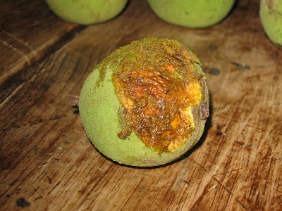 You can see the stem on this one to the right. Now I googled some information on Black Walnut trees and found some interesting facts through the University of Minnesota Extension Program. Hulling the walnuts is difficult and messy, as I found out because I wanted to show you the walnut inside. I used a chainsaw...er, a regular old hammer and pounded like all get out until I managed to make a small crack. Then I used the other side of the hammer (the side with the two pieces you use to remove nails from the wall after an overzealous and frenzied hanging of pictures that I have been known to do. I pried away this tough skin as you can see below...
