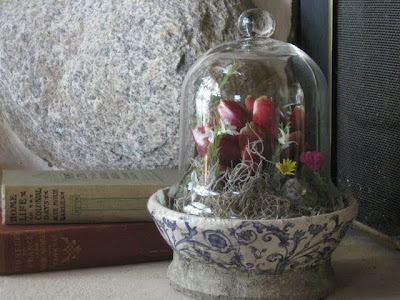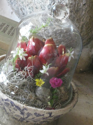 And finally. My finished cloche. Vessel also bought from the Farm Market. Inside is an avocado surrounded by different mosses and various faux and dried flowers. It sits on the hearth of the stone fireplace at the Lakehouse. Jody's cloche sits on my harvest table.