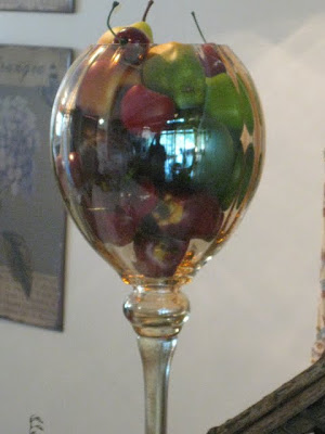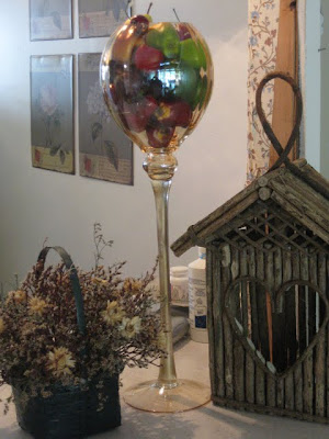 Above is a gift from friends that came to visit us at the Lakehouse a few weeks ago. Thank you Carol & TJ!! It looks like a huge wineglass. Whoa...Partaaaay! No, it was empty and ironically, right on the bar that it is sitting on, I had a box of faux fruit from Target, just looking for a container. As our hostess Marty advised, we could use all types of vessels in this party, therefore I present, 'The Humongous Wineglass With Fruit'!!