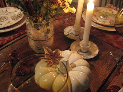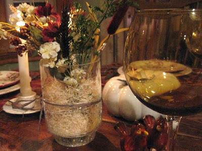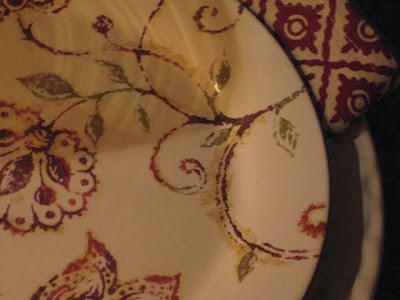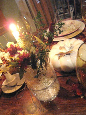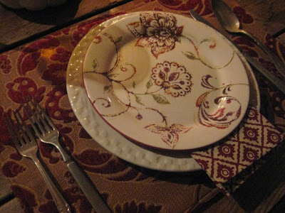 As I said earlier, the tablescape started with me looking for a basket to make more of these floral arrangements that are starting to become a passion. I went into Pier I to look and of course, never did. They have TONS of new fall items and many dishes that are sort of transitional from fall to winter, as I think these dessert plates are. I bought these, the place mats and the wine goblets, and then my mind started to put these together with the items bought at HomeGoods.