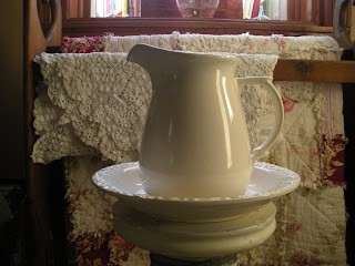 I paid a whopping $12.00 for this. The bottom shows a little wear and there is nothing on it as far as origin, but I don't profess to know my antiques, I just know what I like. Maybe it's from K-Mart. Behind the pitcher on my quilt rack is a round tablecloth I also bought that needs a few stitches here and there but is going to look wonderful on my table. Can you feel me smiling? :-))