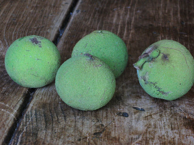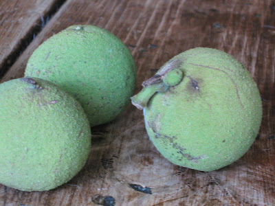 These are walnuts I picked up off the ground. They are a bit larger than a golf ball, and have a little of texture to them. They smell a bit fruity and spicy. These outer coverings will leave a yellowish stain on your fingers, so wear gloves if you are handling them.