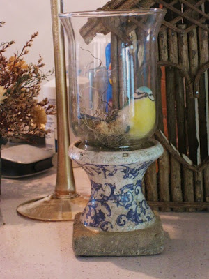 I made this little crackled vessel, well you know, did the arrangement inside. My angel Jody must still be by my side because I am having so much fun doing this. I should have turned it so you can see the little raffia bow, maybe you will see it in another picture (or the 8 X 10 I blew up for the dining room). I used this in the tablescape but I am giving it to my sister in law, Megan, who just moved into her new home and had her baby 4 days later!! Little Conor joins sister's Maggie and Trisha and their father, Declan! Pictures to come. In the vase, I used wood wool which I found at Michael's. I was inspired to try this rather than moss after seeing a post by Coty Farquhar, where she had used it to make over 600 nests for candy as favors at a wedding. She was very sweet in telling me what this stuff is and how to find it.