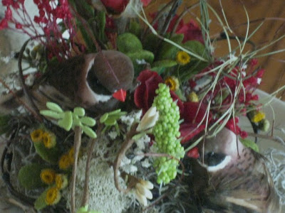 The following day, promptly at three 'o clock, I returned to Village Floral. And there Jody stood with my beautiful cloche and a bill for $20.00. My eyes lit up. It was magical, as you can see. Two little brown birds and all sorts of greenery and moss. Jody brushed her wings back with her manicured fingers that had delicately created this little domed wonderland. She patiently explained to me that she placed a piece of floral foam on a reversed piece of duct tape and attached it to the bottom of the cloche. This way, nothing is glued down and I can change out the cloche any way I want. Jody is one sharp angel. Then she said, "Shhh...come with me.", and she led me back through the aisles of silk floral arrangements, past the cool refrigerators filled with gorgeous roses, carnations and daisies. Back to where she opened a secret door. And in the dimness of the room, I saw shelves of faux silk flowers and grasses, tiny rose buds and dainty baby's breath. It was a fever dream of florals! She took a plastic bag and filled it with tiny flowers with stems. She added moss and to my astonishment, reindeer moss, which I had only heard of in a dream (or from a blogger). She added tiny birds and nests and some dried flowers. She gave me the bag and quietly said, "Do what you will with this. You are on your own. And please don't make a fool of yourself at the party." And then with a swoosh of her angel wings, she was gone.