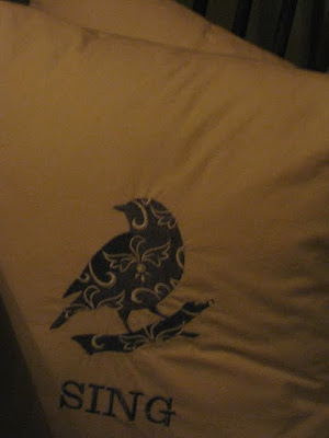 I also bought this little guy for my bedroom at the lake, which is blue. Aren't her pillows darling? And very reasonably priced. I bought some tea towels as well that she makes out of muslin. I wish I had taken a picture of a few of them with their embroidery. They are very large when unfolded and I used one to line a large basket that I keep all my pretty hardcover decorating books in by my bed. It has the Eiffel Tower on it. I should have taken a picture of that too, but I was so worried that darn battery was going to run out (I never fully charged it).