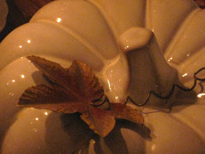 I waited until dusk to take the pictures because the sun goes over my house and the photos turn out better. Everything was set up so nice and then I found the camera battery needed to be charged. Grrrr... The Husband came home and asked, "What are WE having for dinner?" lol!! I bought the pumpkin at a drugstore and the candle holders are from a thrift shop.