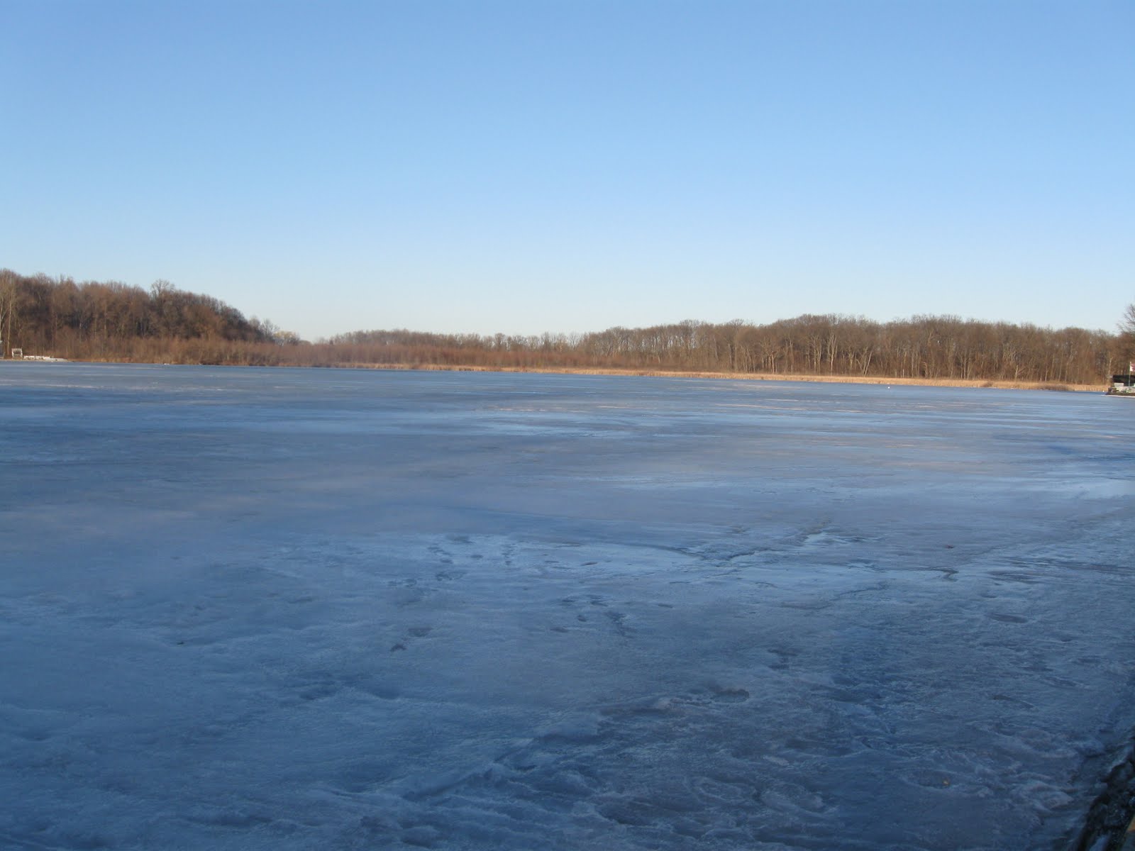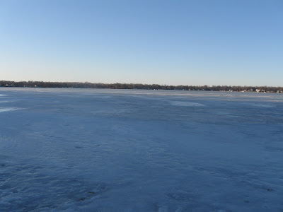 Warning: These pictures may make you shiver. The lake is covered with a sheet of ice. It's hard to believe that 5 short months ago we were zipping around in our boat and swimming at the sand bar. And it will be awhile before we are doing that again.