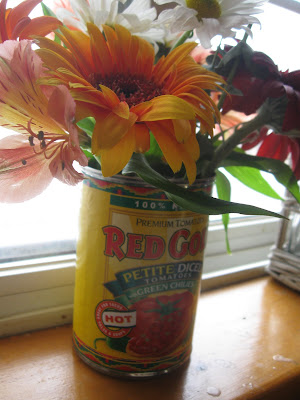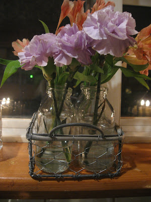 It wasn't all melancholy {baby} as I am making it sound. We weren't stocked up with food so we had 3 wonderful dinners out. Saturday we went to a small town about 45 minutes away and browsed around an old bookstore. It also carried new books and I bought a book of short stories by Alice Munro. It was sad to see that some of the antique stores we love were closed down with For Sale signs in the windows. Here I go getting melancholy again. We visited the gift shop in town and I bought a beautiful big trellis, about the size of a twin headboard, for planting flowering vines on this summer. I also bought a big bouquet of flowers that I filled several vases with and that really brightened everything up.