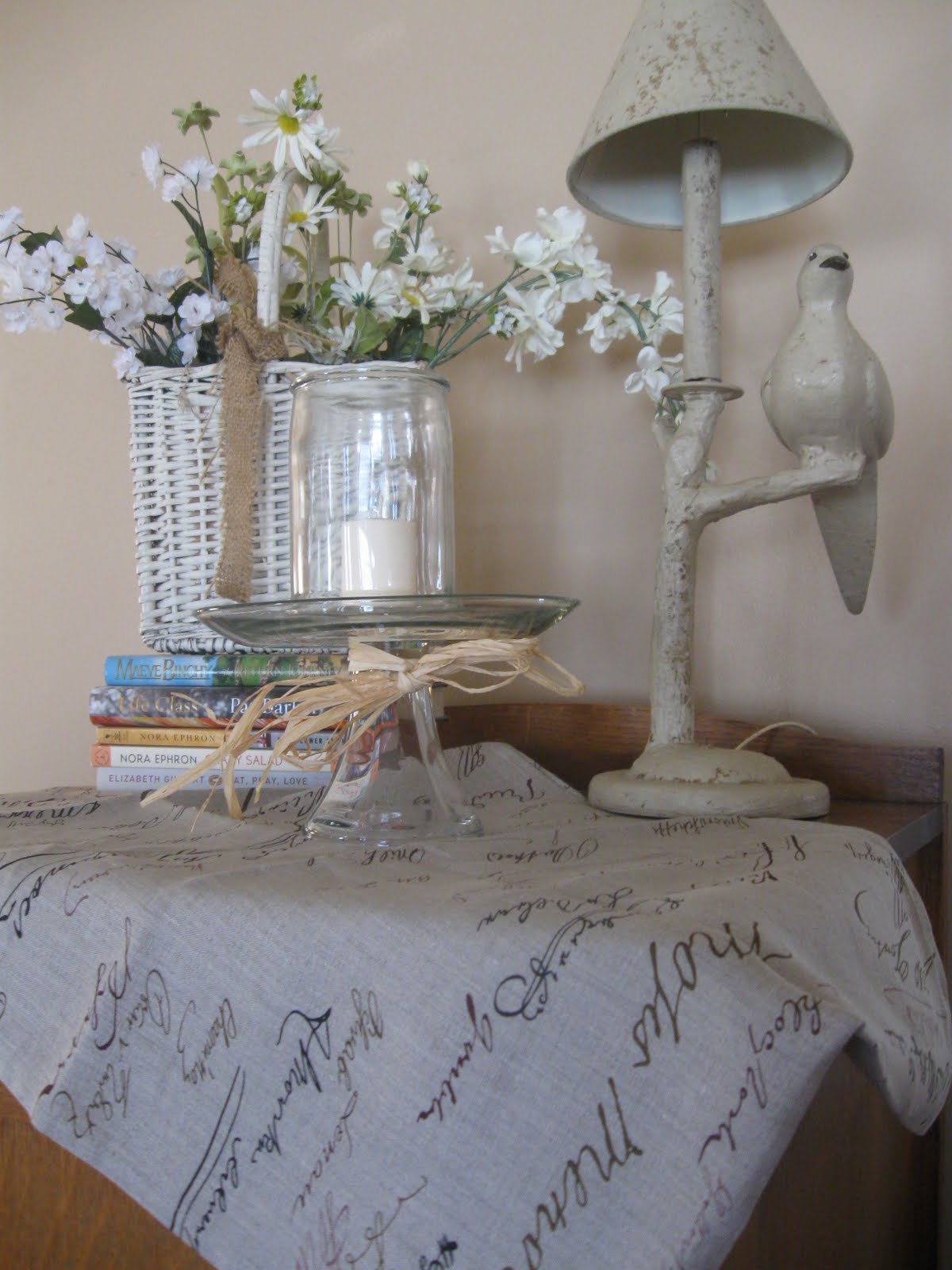 This is a table runner with script that I found on a shopping website. I love it on my old cabinet.