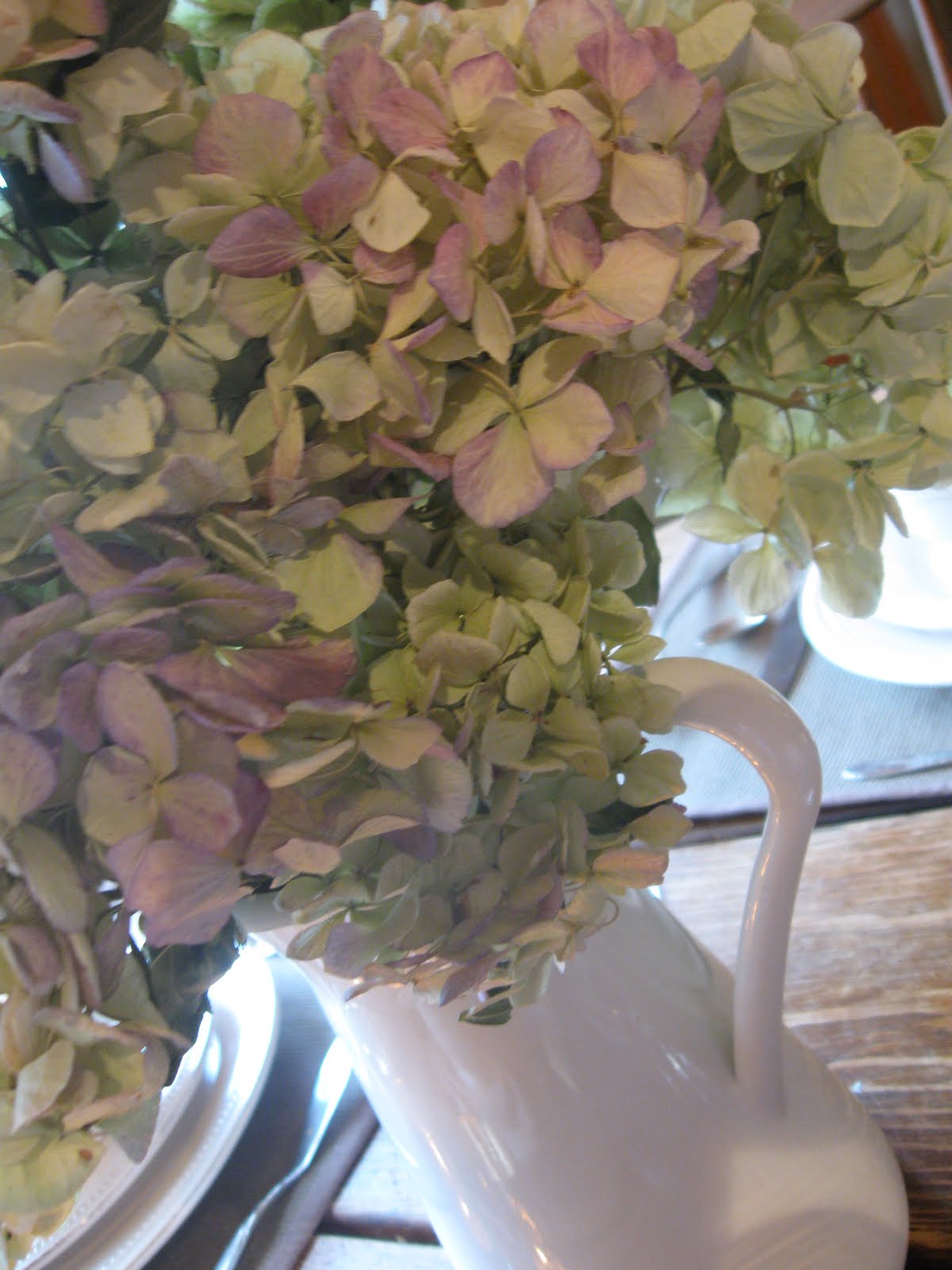 These are dried hydrangeas that I bought on eBay. Can you order dried flowers on eBay? You bet your sweet Pay Pal you can! They arrived from the farm packaged just so, not a petal dropped. The enamel pitcher is from IKEA.