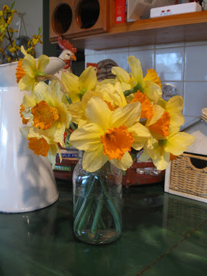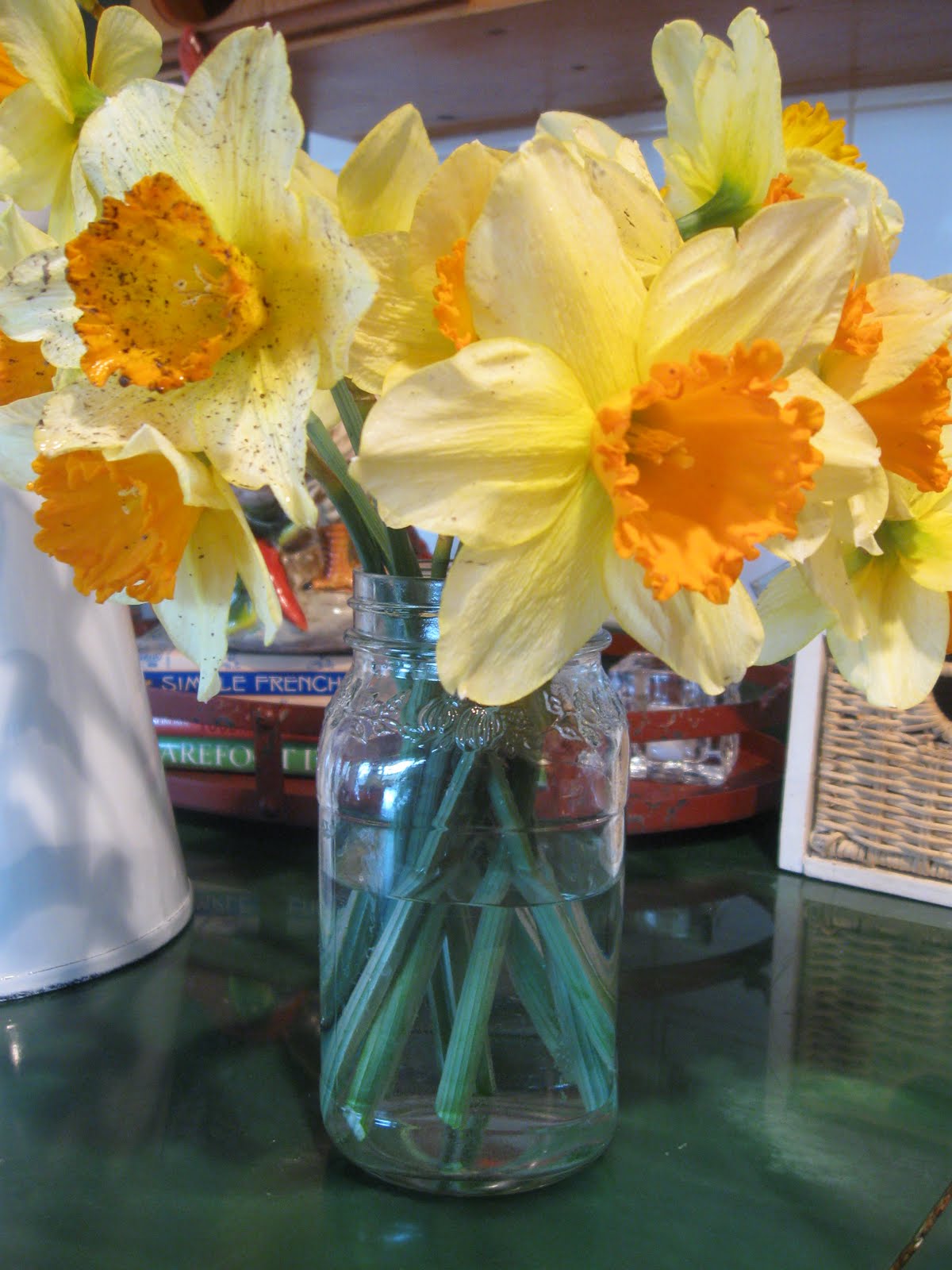 Have you noticed that I have been posting more often? I guess because I am less busy, which doesn't make for a really interesting post. Oh...come summer. Fun~busy. But I am not going to complain about wanting summer to come because it seems like spring just arrived. And along with it, a lot of rain. I cut these daffodils a little while ago and you can see that they are spattered with mud. The ground is saturated. Thus, no playing in the garden, which means I will not be getting any vegetables until around August. Okay, this may turn into a complaining post.