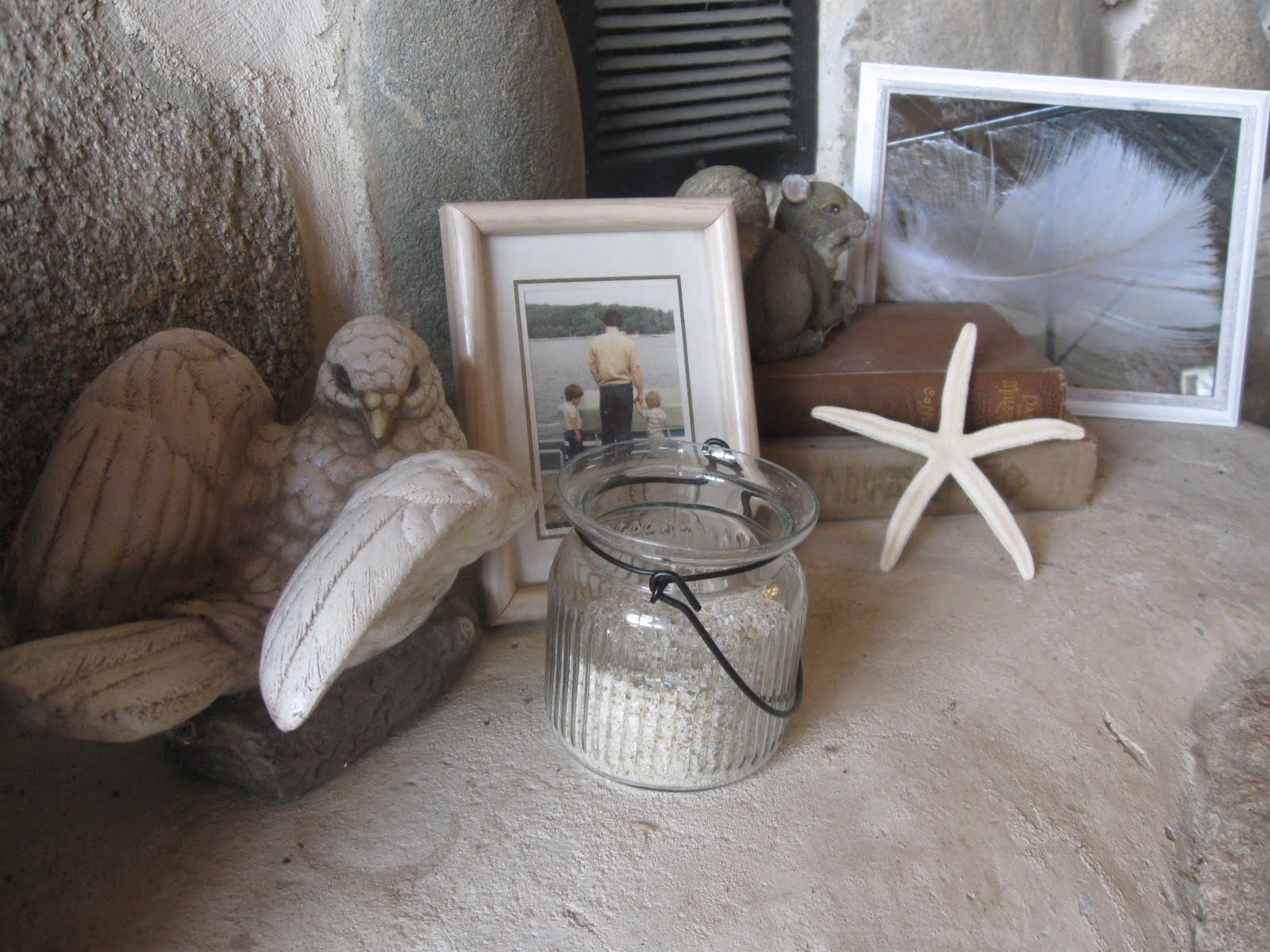 This is one end of the hearth. It's just a little vignette of things I love...a sand filled tealight holder, a bird, a picture of a swan feather that I took, and an old picture of The Husband with the boys when they were wee ones, standing on the dock.