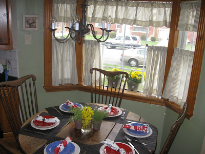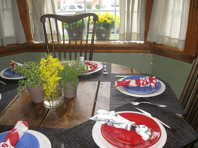 In setting the table, I had some bright dishes, but all of my napkins were pretty bland. I think a shopping trip is in store. Emily found some fabric she had from school and fashioned some napkins in red, white and black. Aren't they cute?