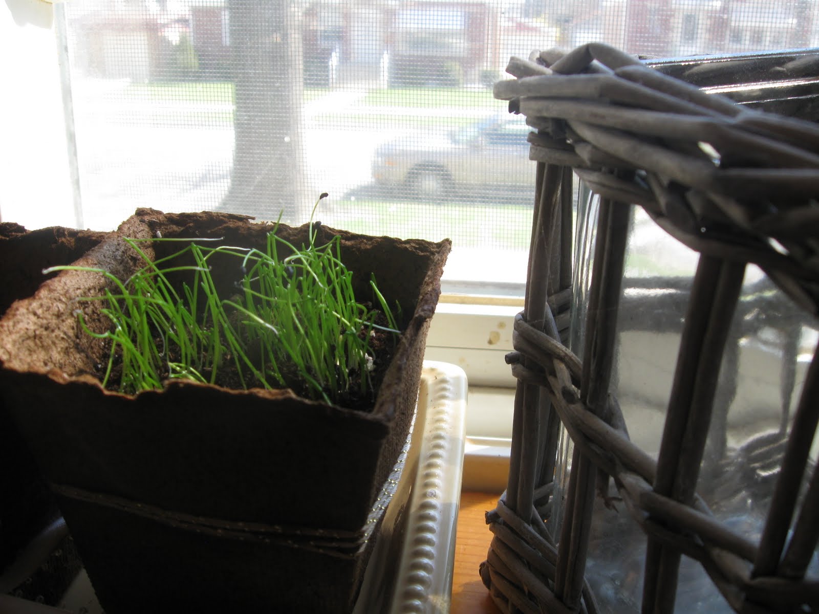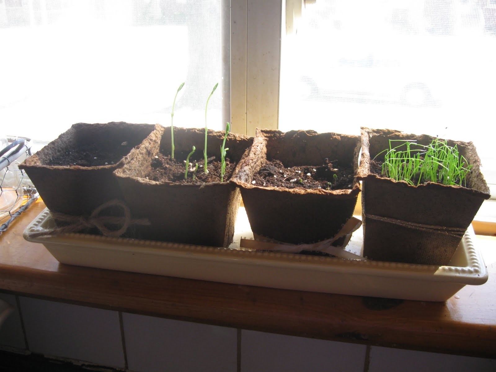 The little seeds that I planted 10 days ago are coming up nicely. Well, the chives and sweet peas are doing well and the rosemary and basil are a bit behind. I feel like a little kid with a science project. This will amuse me until I can get out and get my hands in the dirt. It's all about patience, I guess.