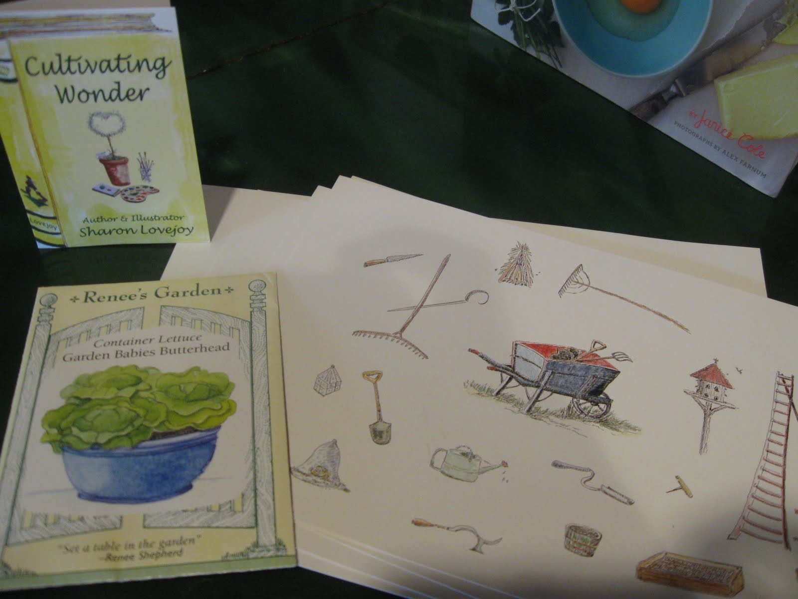 Sharon also sent me these cute little note cards she illustrated and some lettuce seeds. If you go to her blog you will see what a wonderful artist and writer she is and stick around for a tour of her magical garden. This is good reading. Thank you so much, Sharon!