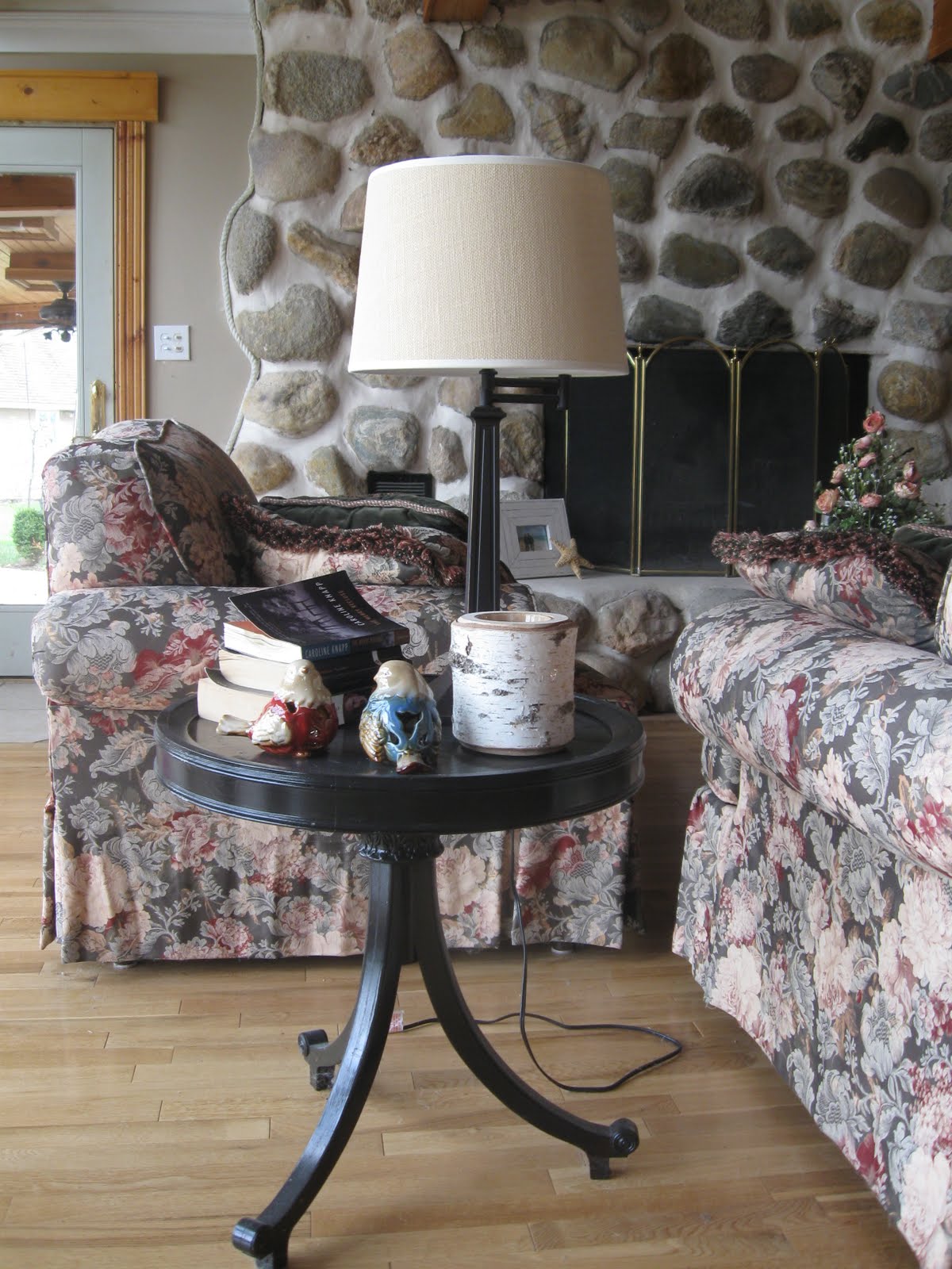 I bought this little table at an antique store and finally brought it up to the lakehouse last year. I was going to paint it white and then changed my mind. Somehow, it just seems to go better with the furniture in black. How do you think it would look in white, or even gray? The lamp and linen shade are from Target.