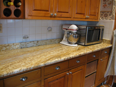 This is a closer view. I like that the granite has more marbling than spots. I kept my wall tile which is white with a few squares of French wine labels that I had hand painted years ago.
