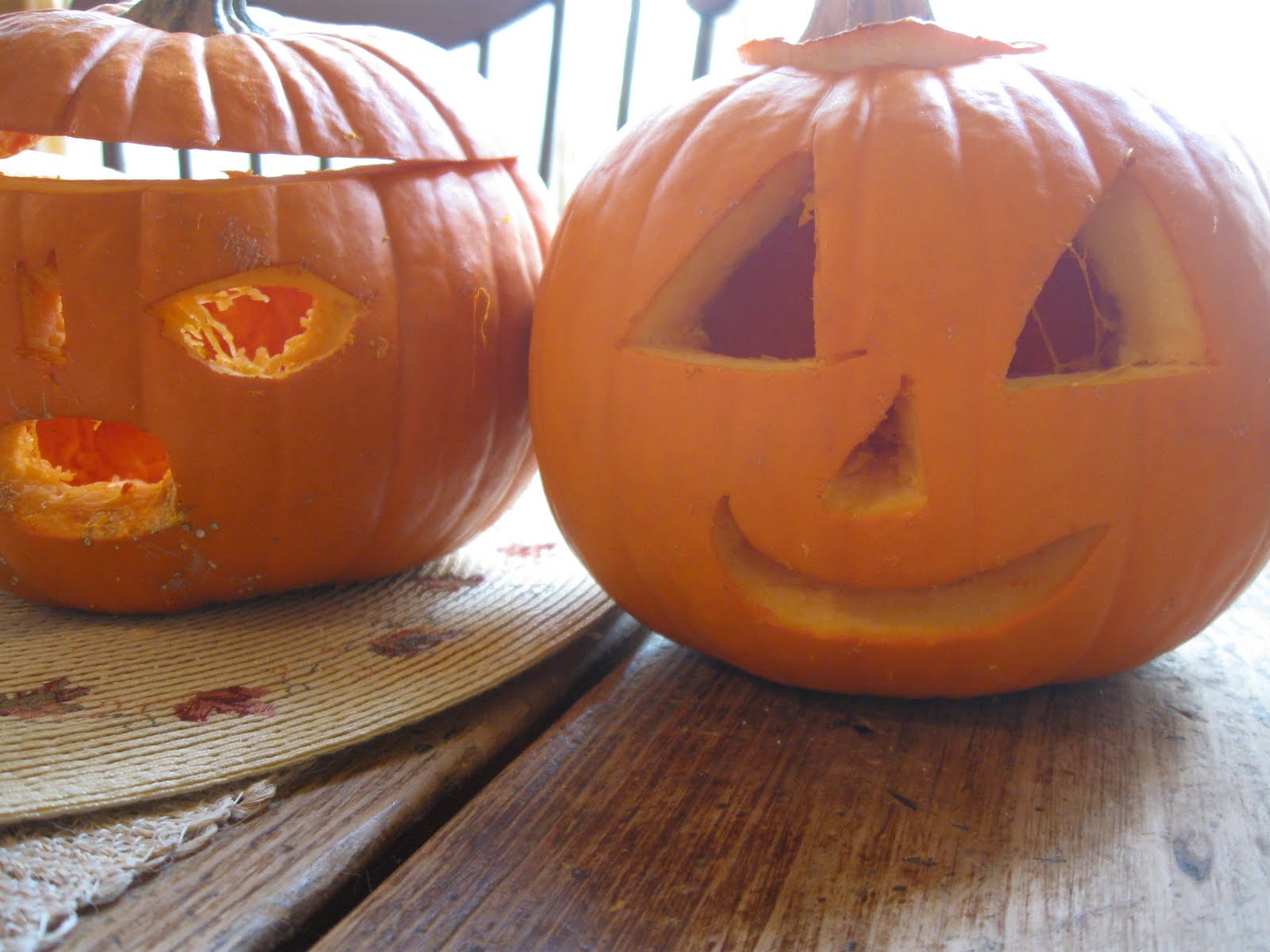 On the way home we stopped at my favorite nursery so that I could get new pumpkins {now that the squirrels have feasted on the buffet I put out last week}. I bought one for me and one for Abby to carve, but she was immersed in a scary movie. So I got to work with my nifty little orange knife. One guy is mean and one is happy. I was really looking forward to toasting those seeds, but that is when I found out my computer panel had died. I'm really not having much pumpkin luck this year.