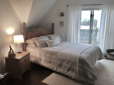 Here again I have an example of how upholstery can make a big difference, but lets you keep the style of your pieces. The settee is quite unusual but elegant with the camel back. It's a juxtaposition with the country style glider rockers. Still, there is nothing like sitting on one of those in the early morning (my fave is the one on the left), with a cup of coffee in hand, watching the birds come to my feeder and birdbath. I found the ottoman for a song at Pier 1, and daughter Emily, a designer, who worked at a high end furniture store, was amazed by the craftsmanship and detail. She felt the same about the furniture, which was covered by a family owned business here in Michigan. The only other new thing we added was the 'eyelash' rug from Target. It's no longer available. It is so soft and durable, I wanted to have it in our master. Alas, never coming back.